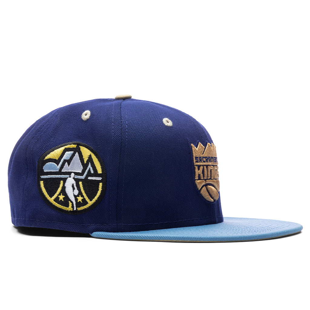 This New Era x Feature Sacramento Kings Navy/Sky/Tan 2023 59FIFTY Fitted Hat was released by Feature. The fitted has a navy blue six panel structured high crown, tan embroidered eyelets and a tan fabric squatchee button. The flat bill of the fitted cap is sky blue with a tan undervisor and black sweatband. The front panel features the Sacramento Kings logo embroidered in navy blue and tan stitching. The left panel of the fitted displays the New Era logo and celebratory side patch on the right panel. The official NBA & Feature logos are embroidered on the rear crown in tan stitching as well.
