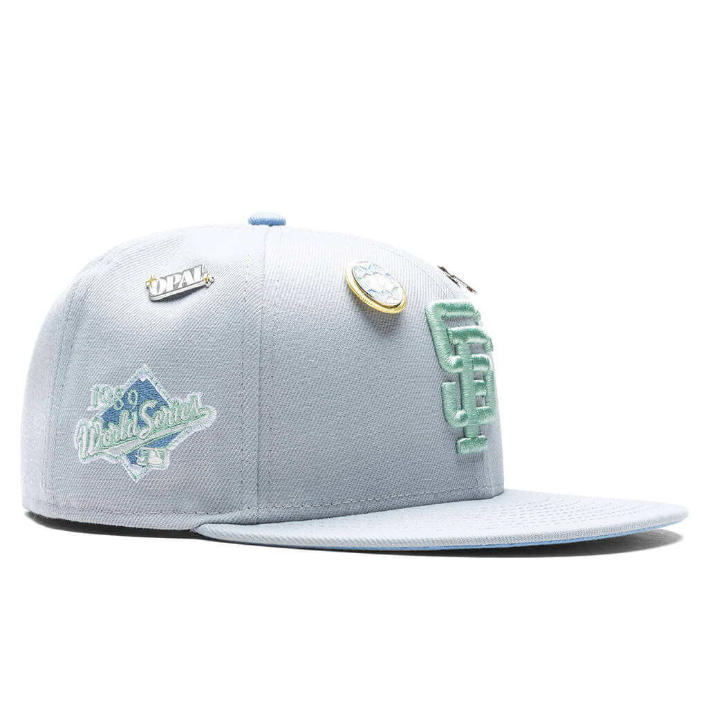 This New Era x Feature San Francisco Giants "Opal" 59FIFTY Fitted Hat has a light grey six panel structured high crown and embroidered eyelets with a sky blue fabric squatchee button. The fitted cap has a light grey flat bill with a sky blue undervisor and white sweatband. The front panel features the San Francisco Giants logo embroidery. The left panel of the fitted displays the New Era logo and the official MLB logo embroidery on the rear crown.
