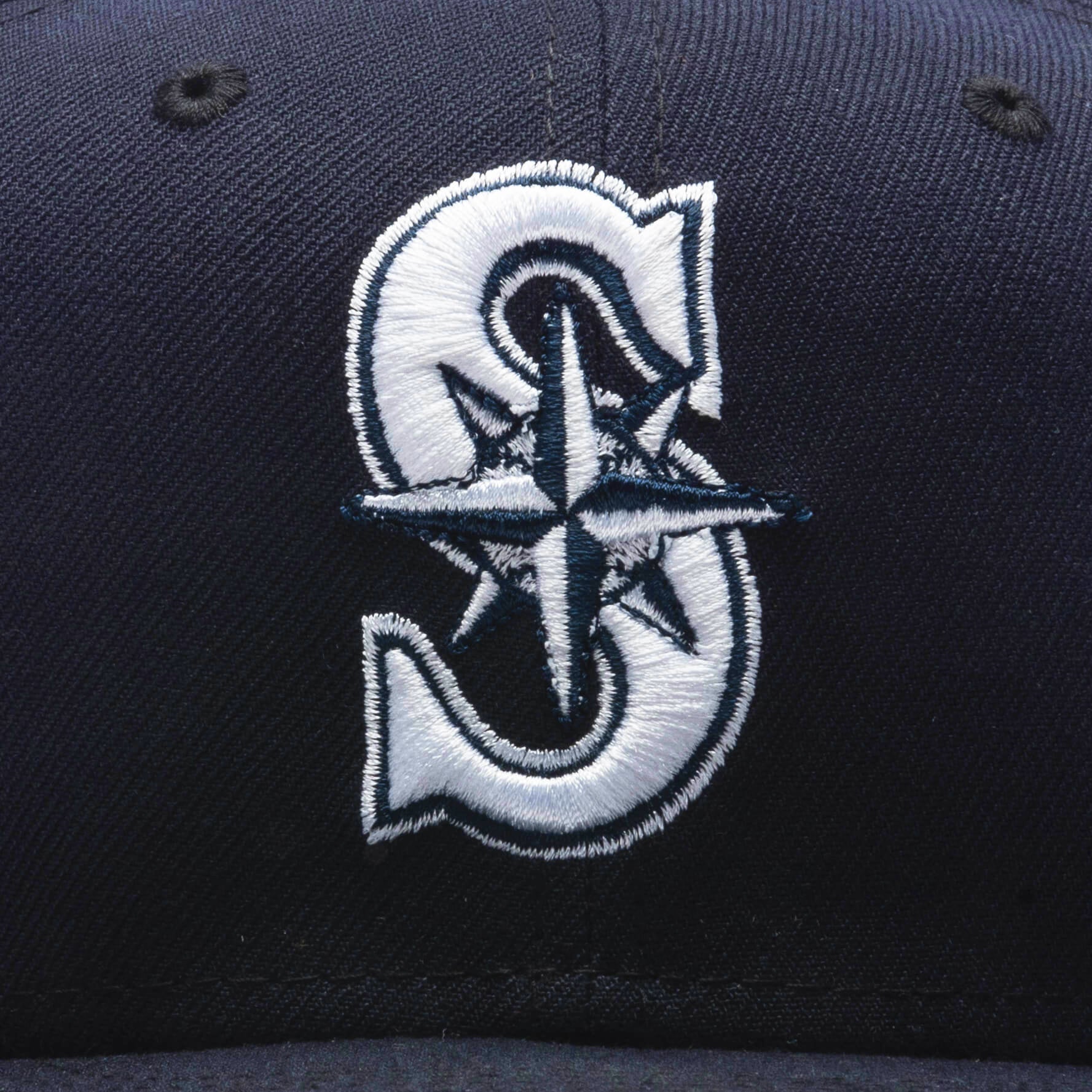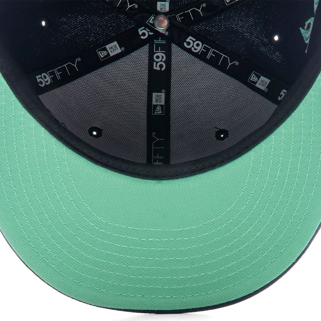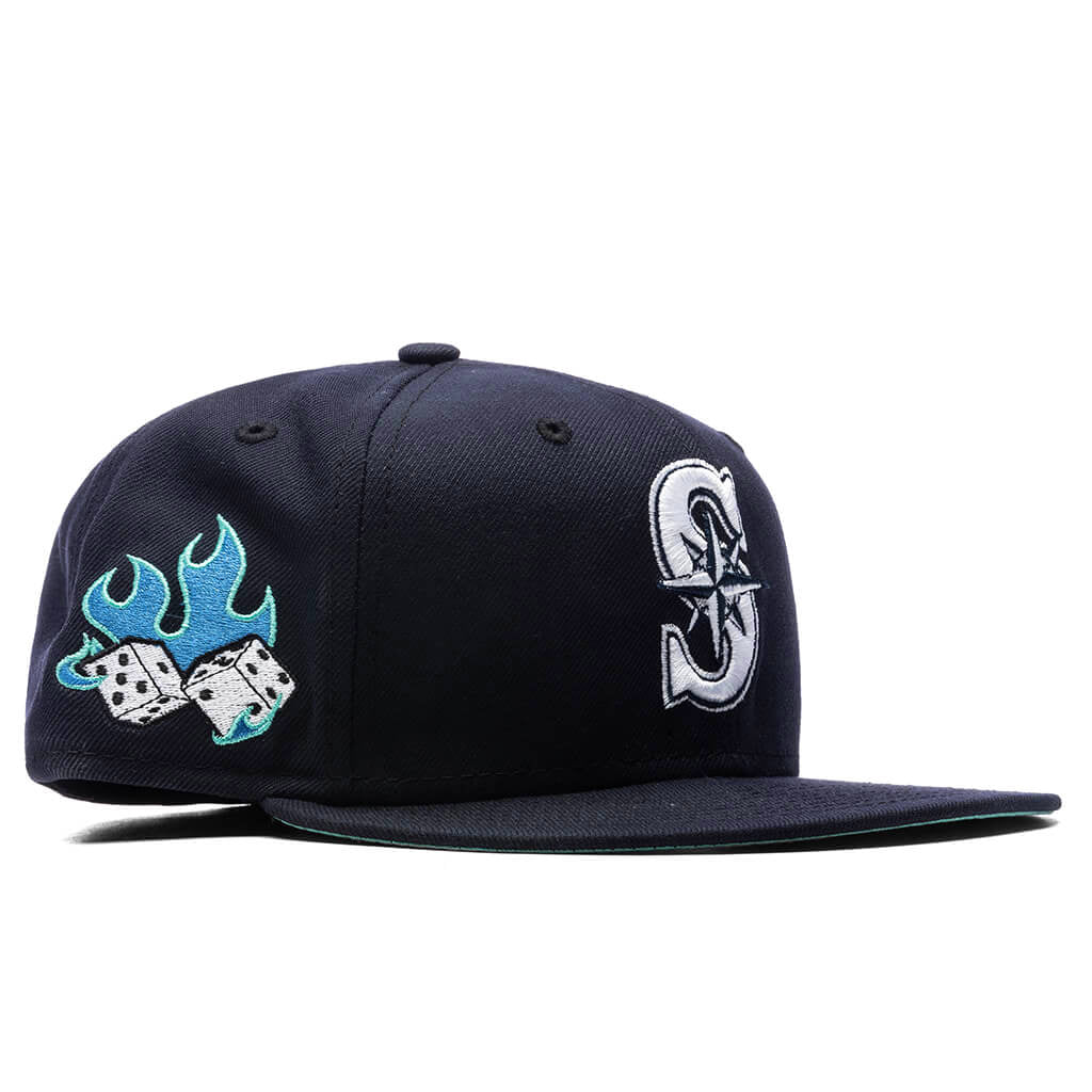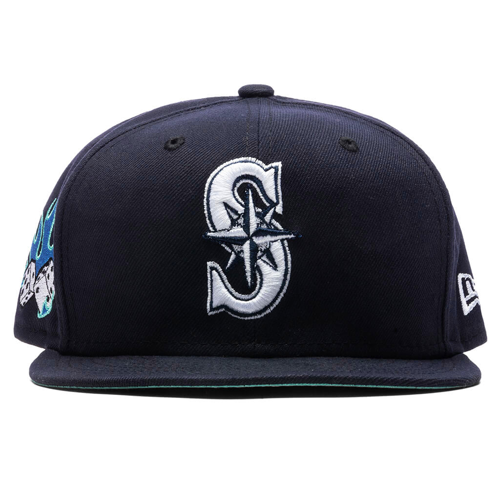 This Seattle Mariners 59FIFTY fitted hat was released by Feature. The fitted has a navy blue six panel structured high crown and embroidered eyelets with a navy blue fabric squatchee button. The fitted cap also has a navy blue flat bill with a clearmint undervisor and black sweatband. The front panel features the Seattle Mariners logo embroidery and flaming dice side patch embroidered in blue, white and clearmint tone on the right panel. The left panel of the fitted displays the New Era logo in white and the official Feature branded logo embroidery on the rear crown.