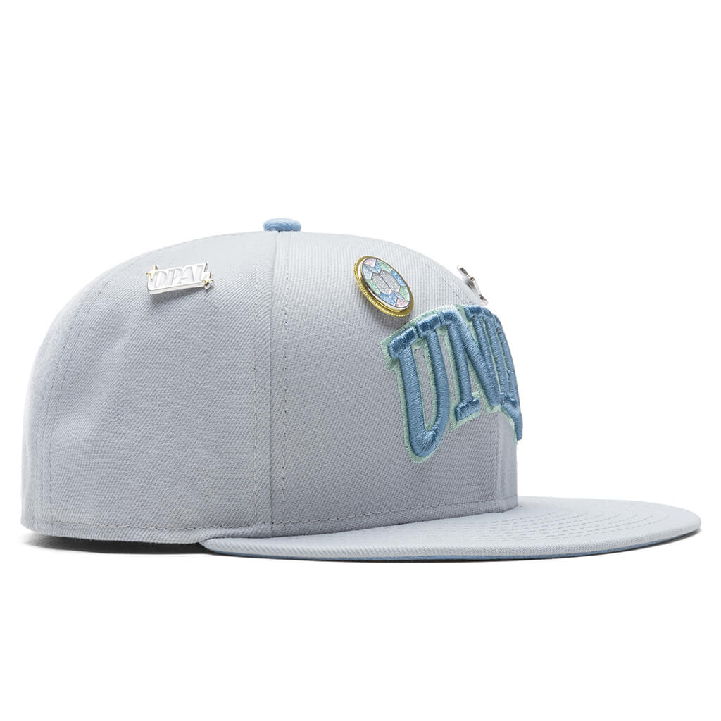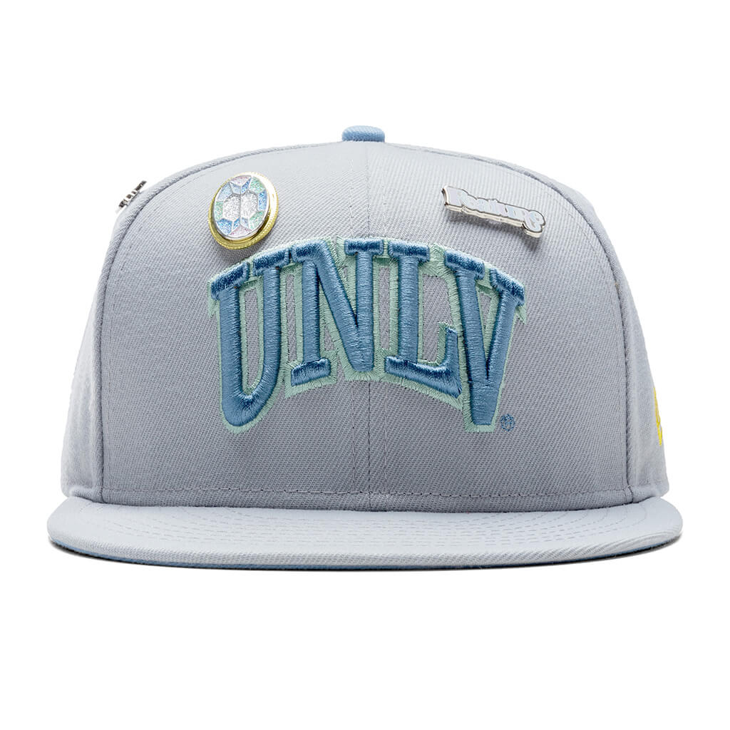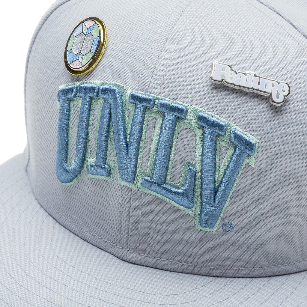 This New Era x Feature UNLV Rebels "Opal" 59FIFTY Fitted Hat has a light grey six panel structured high crown and embroidered eyelets with a sky blue fabric squatchee button. The fitted cap has a light grey flat bill with a sky blue undervisor and white sweatband. The front panel features the UNLV Rebels logo embroidery. The left panel of the fitted displays the New Era logo and the official NCAA logo embroidery on the rear crown.