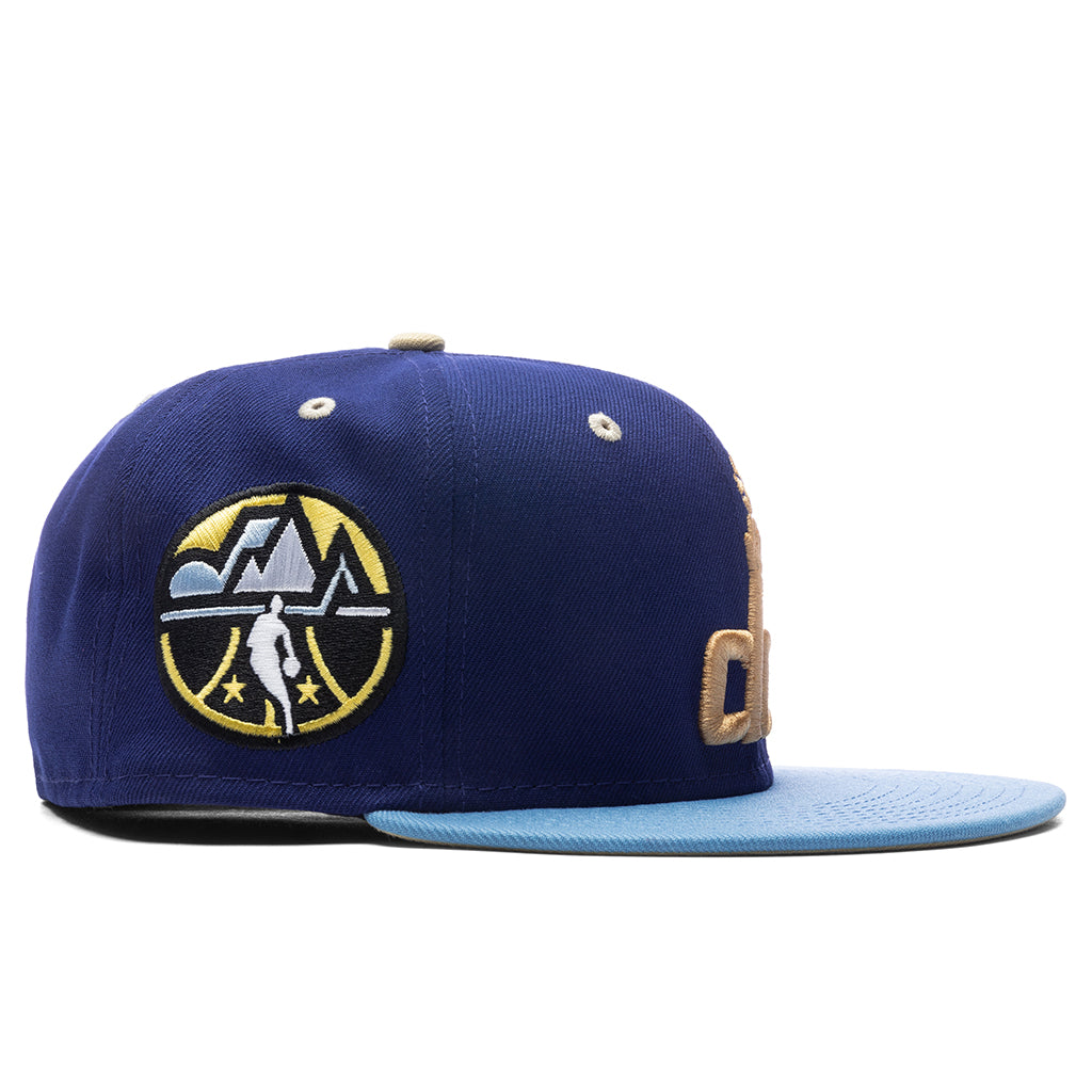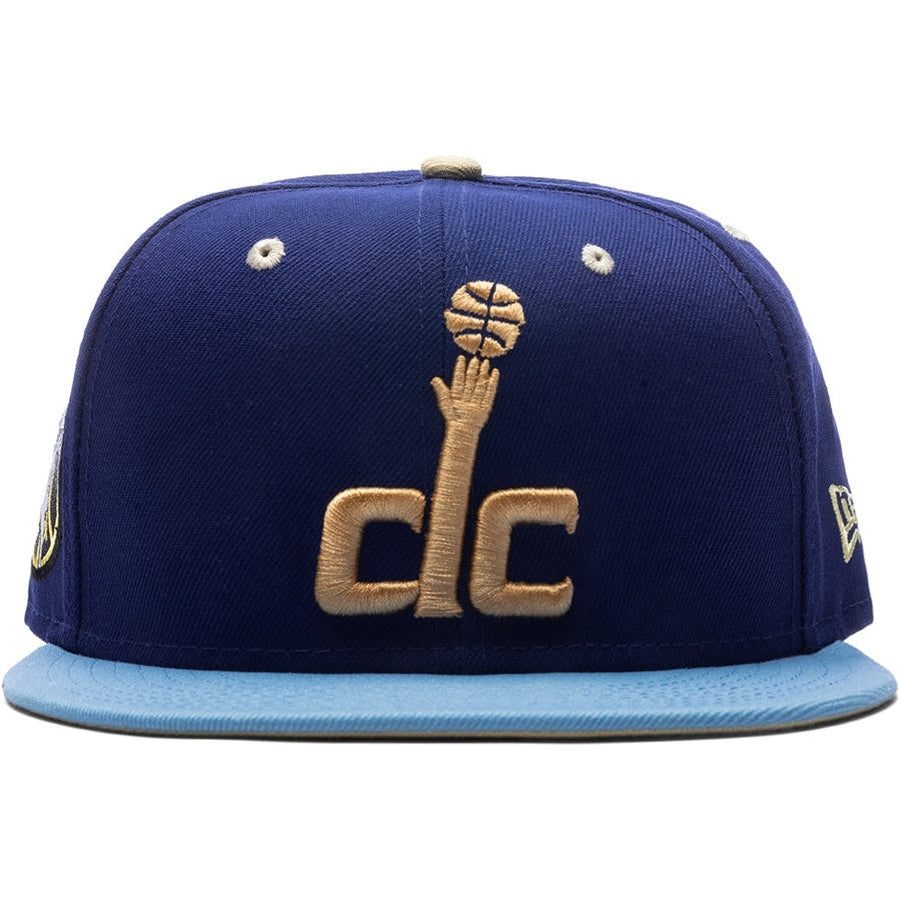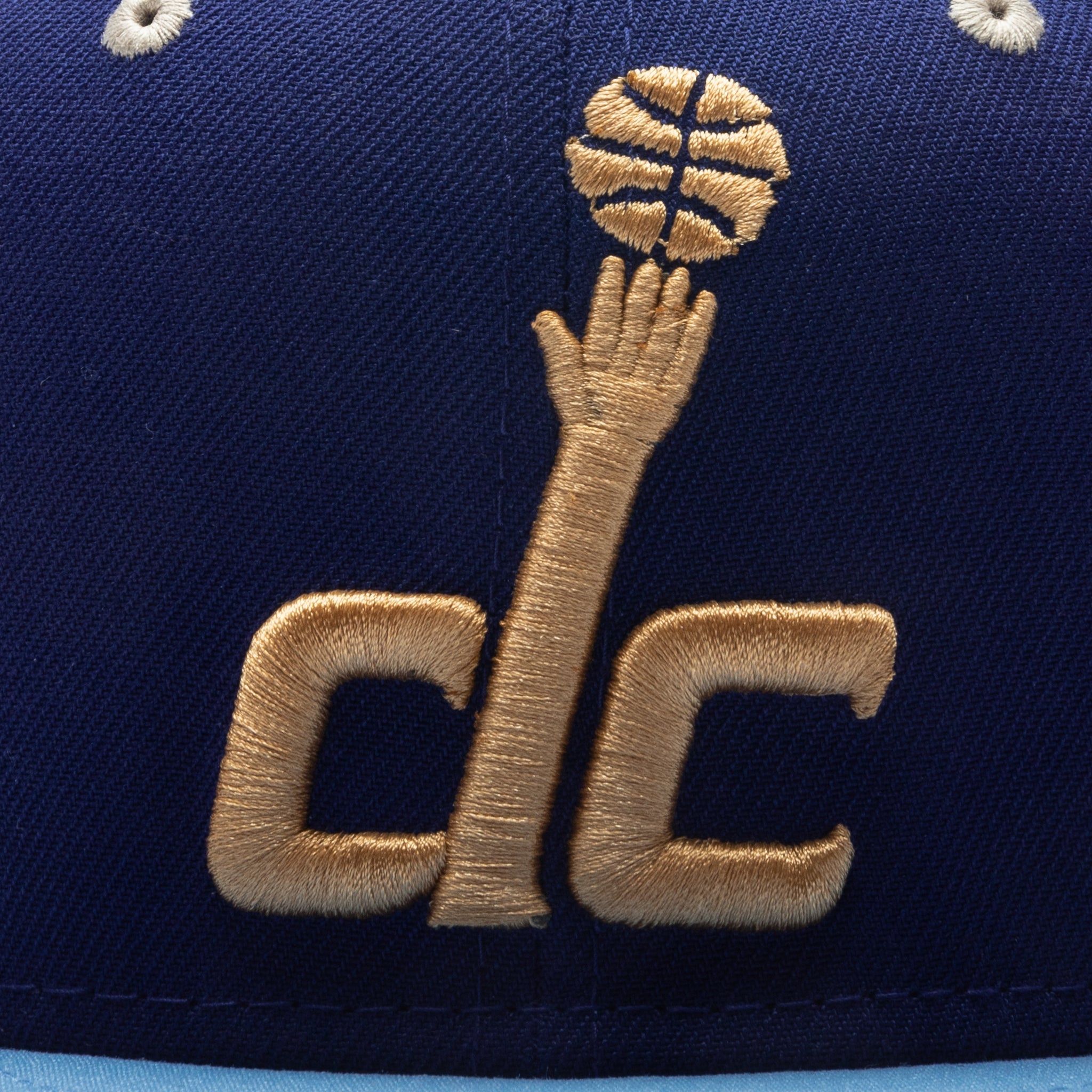 This New Era x Feature Washington Wizards Navy/Sky/Tan 2023 59FIFTY Fitted Hat was released by Feature. The fitted has a navy blue six panel structured high crown, tan embroidered eyelets and a tan fabric squatchee button. The flat bill of the fitted cap is sky blue with a tan undervisor and black sweatband. The front panel features the Washington Wizards logo embroidered in navy blue and tan stitching. The left panel of the fitted displays the New Era logo and celebratory side patch on the right panel. The official NBA & Feature logos are embroidered on the rear crown in tan stitching as well.