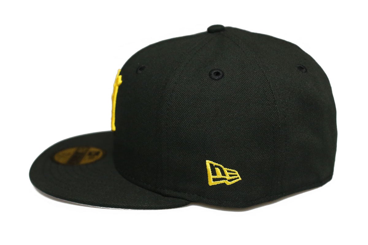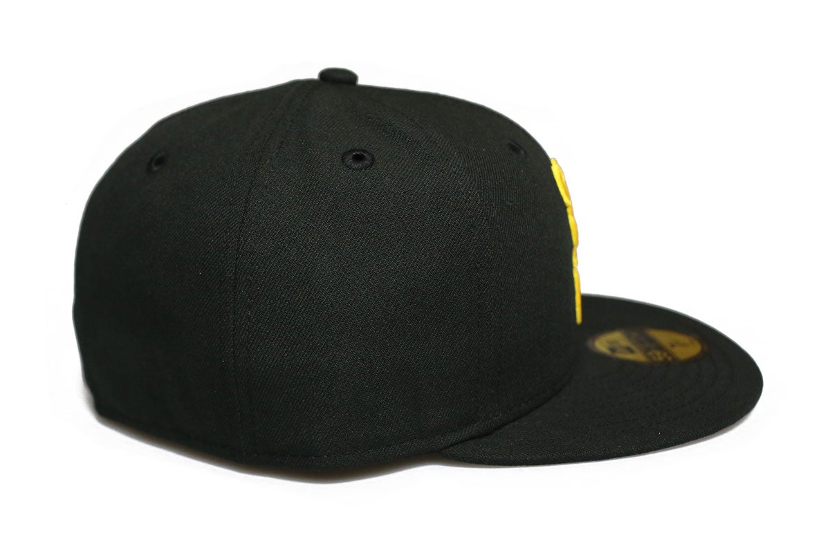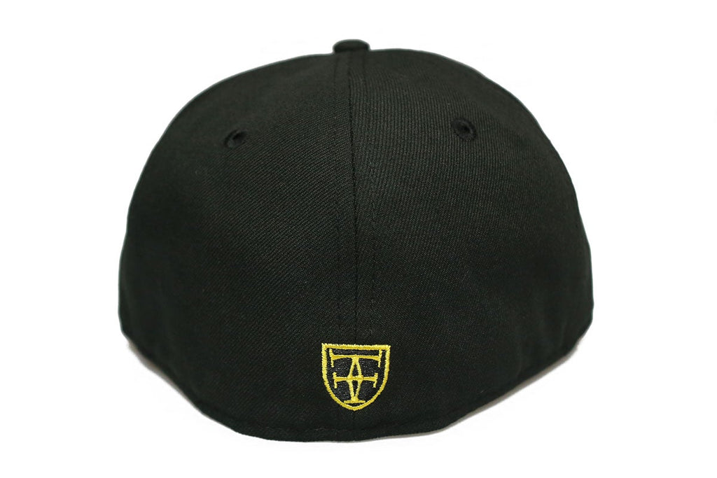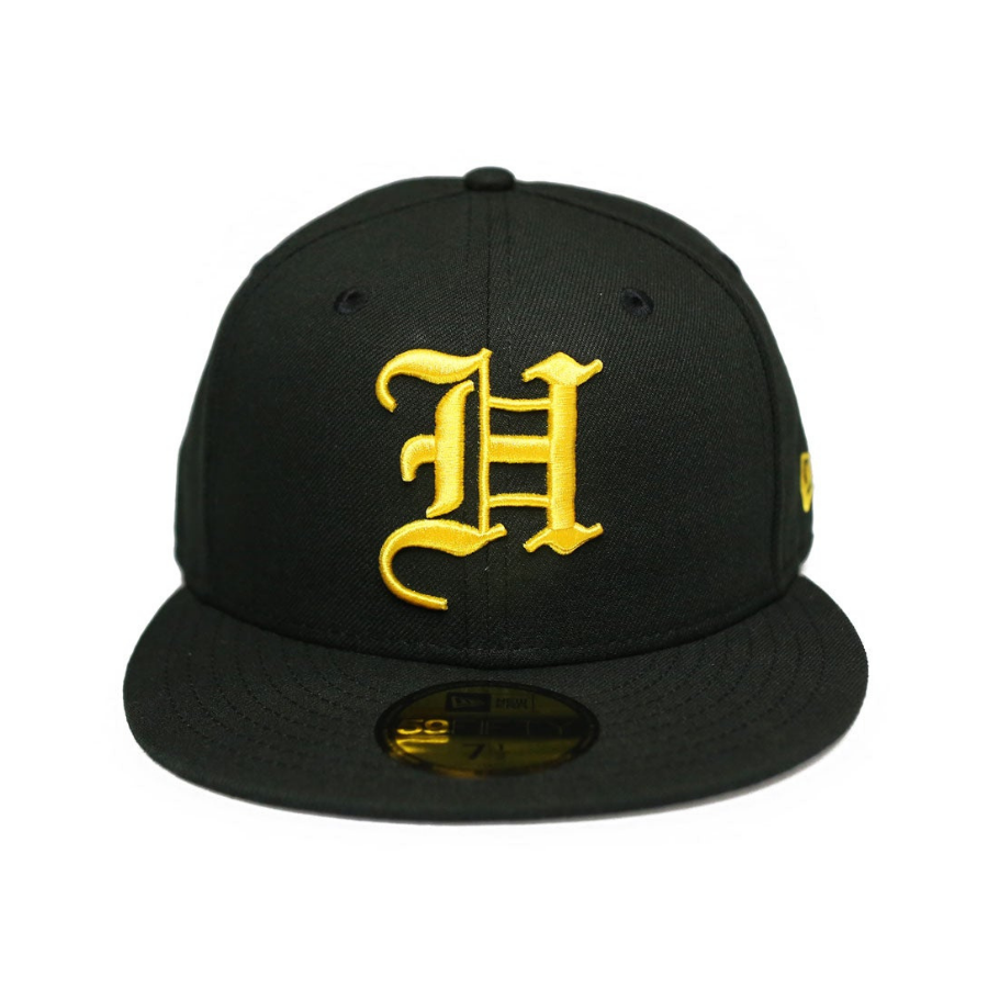 This New Era Pride fitted hat with a black and yellow colorway is a Fitted Hawaii exclusive drop. The 59FIFTY fitted cap has a black six panel structured high crown, embroidered eyelets and fabric squatchee button. The flat bill of the fitted is also black with a grey undervisor and black sweatband. The front panel features a yellow embroidered Bird Old English H lettermark and the Fitted Hawaii logomark embroidered in yellow on the back of the crown.