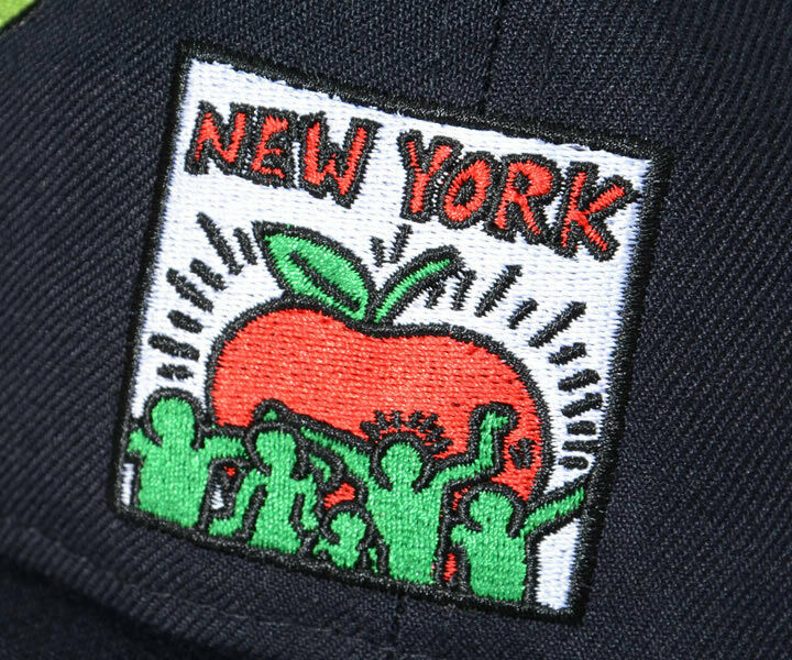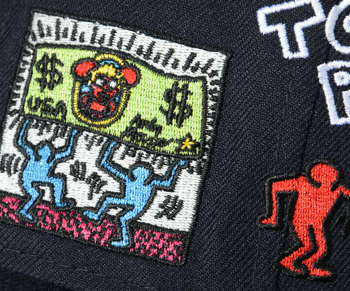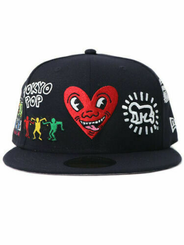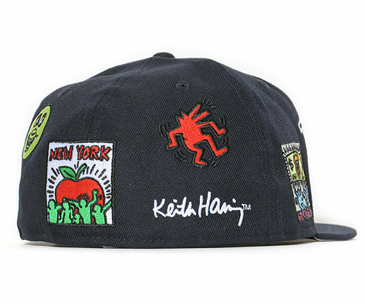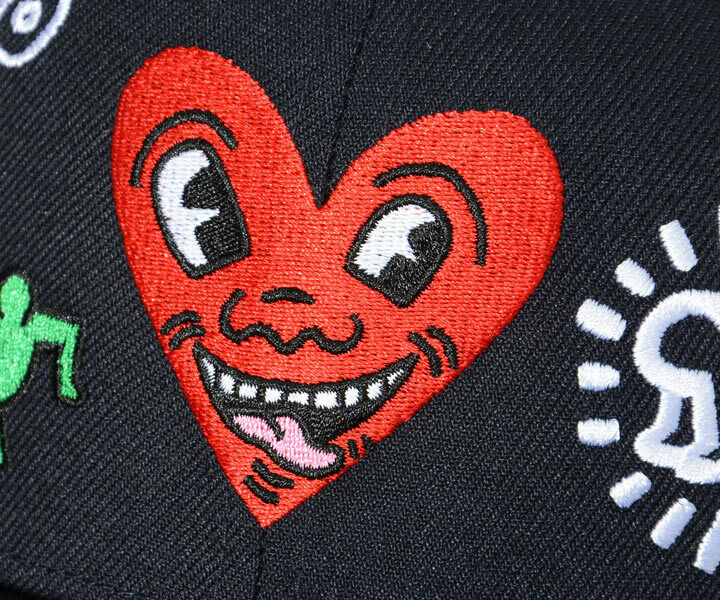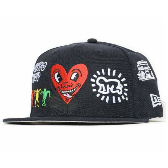 Keith Haring 59FIFTY fitted hat features a black six panel structured high crown, embroidered eyelets and fabric squatchee button. The flat bill of the fitted is also black with a grey bottom undervisor. The front, back and side panels features pop art from American artist Keith Haring whose artwork surfeced during New York City graffiti subculture in the 80's (love this era).