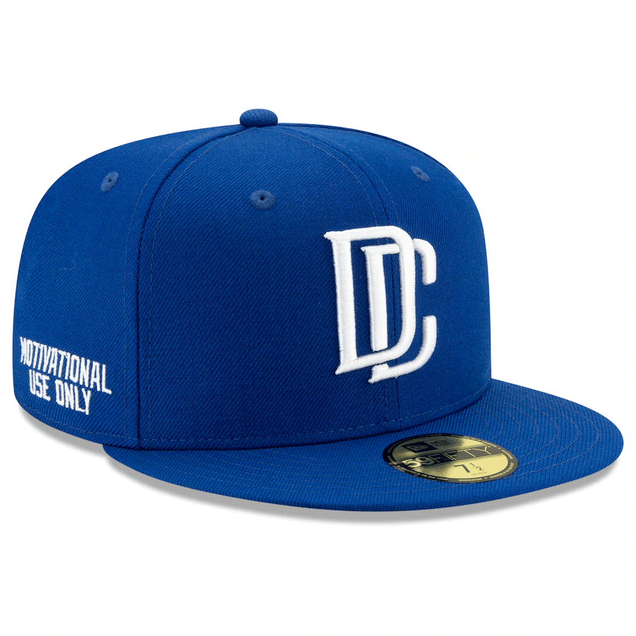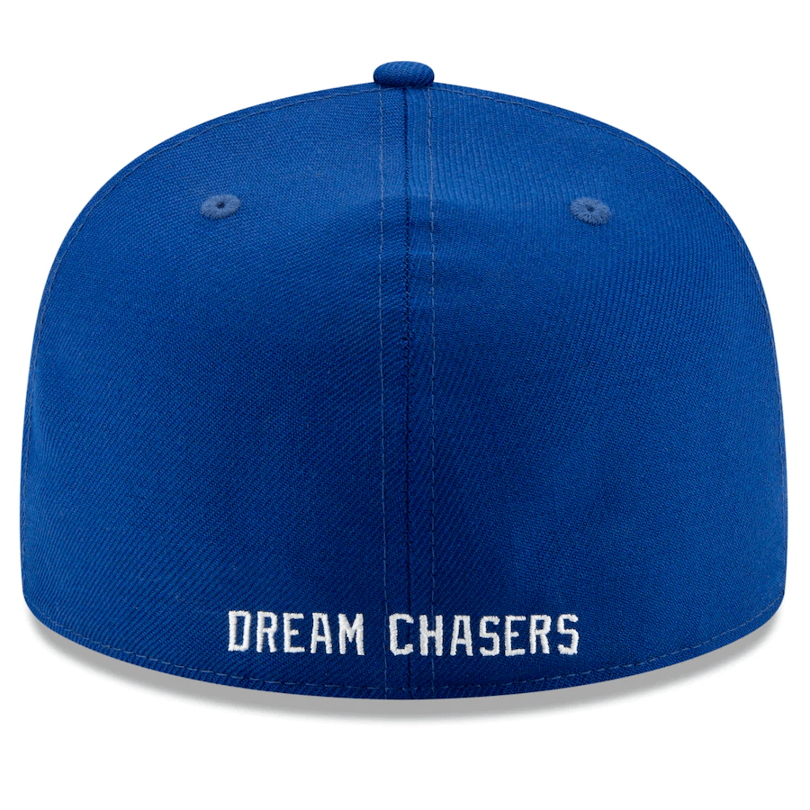 New Era x Meek Mill Dream Chasers 59Fifty Fitted Hat is a solid royal blue including the squatchee button, eyelet and over brim. The front panel displays the "DC" logos overlapping each other in white thread. "DC" logo stands for "Dream Chaser". The right side of the Dream Chaser fitted hat is the the wordmark "Motivational Use One" embroidered in white thread. On the left side of the fitted is the iconic New Era flag logo embroidered in white thread as well. On the back panel of the fitted hat is the wordmark "Dream Chasers".
