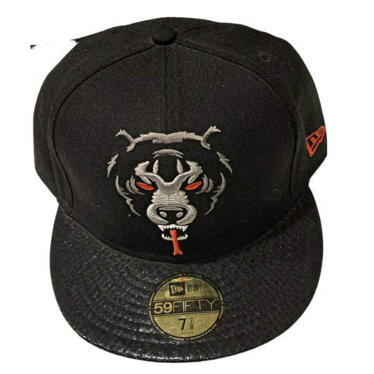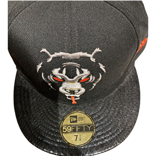 This New Era x Mishka collaboration fitted hat features a black six panel structured high crown, embroidered eyelets and fabric squatchee button. The flat bill visor of the fitted cap is made of faux black snakeskin. The front panel features an embroidered black black with red eyes. The New Era logo located on the left panel is embroidered in red thread.