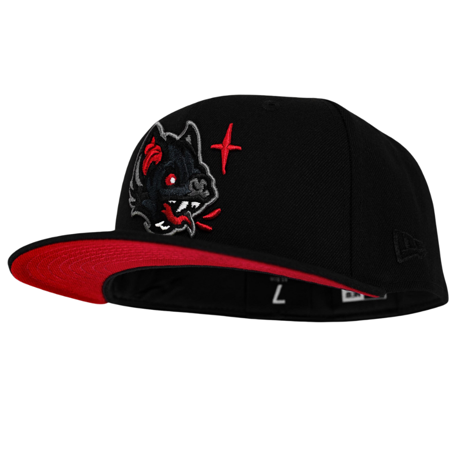 This New Era Bat 59FIFTY fitted hat was released by Noble North. The fitted has a black six panel structured high crown, embroidered eyelets and fabric squatchee button. The flat visor of the fitted cap is also black with a blood red undervsior. The front panel includes a bat graphic embroidered in black, red and white stitching accompanied by the Noble North star. The rear-crown also displays the Noble North logomark.