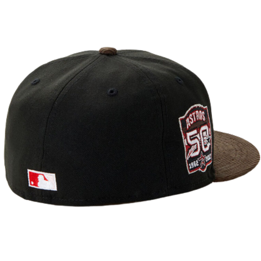 This Houston Astros fitted hat was released by PacSun. The fitted has a black six panel structured high crown and embroidered eyelets with a walnut brown corduroy fabric squatchee button. The fitted cap also has a walnut brown corduroy flat bill with a soft pink undervisor and white sweatband. The front panel features the Houston Astros logo embroidery and a 50th Anniversary side patch on the right panel. The left panel of the fitted displays the New Era logo and the official MLB Batterman logo embroidery on the rear crown.