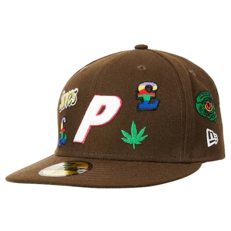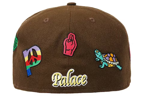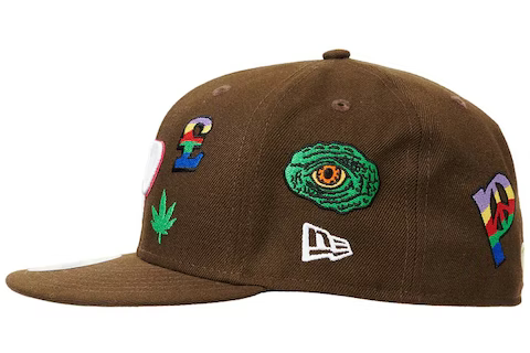 This New Era x Palace collaboration Jesus 59FIFTY fitted hat has a dark brown six panel structured high crown, embroidered eyelets, fabric squatchee button and flat bill. The front panel features the Palace logo embroidered in white thread outlined in red. Across the entire crown are unique embroideries.