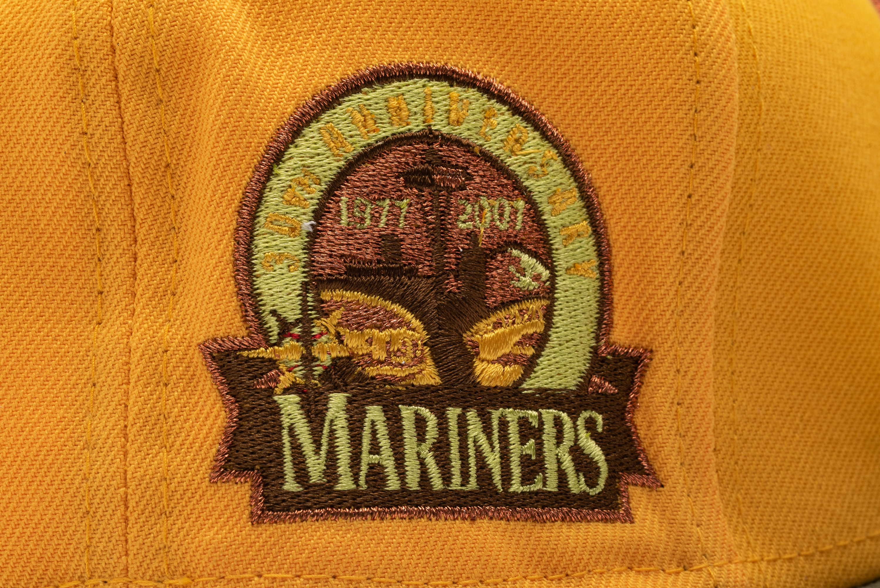 This New Era Seattle Mariners fitted hat was released by Sneaker Politics. The fitted has a gold six panel structured high crown and embroidered eyelets with a copper fabric squatchee button and undervisor. The front panel features the Seattle Mariners logo embroidery and a 30th Anniversary side patch on the right panel.