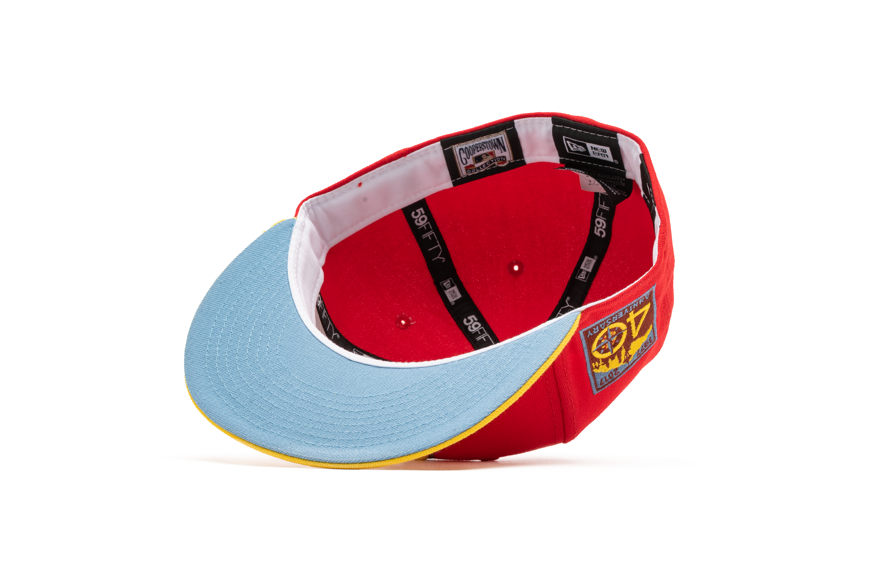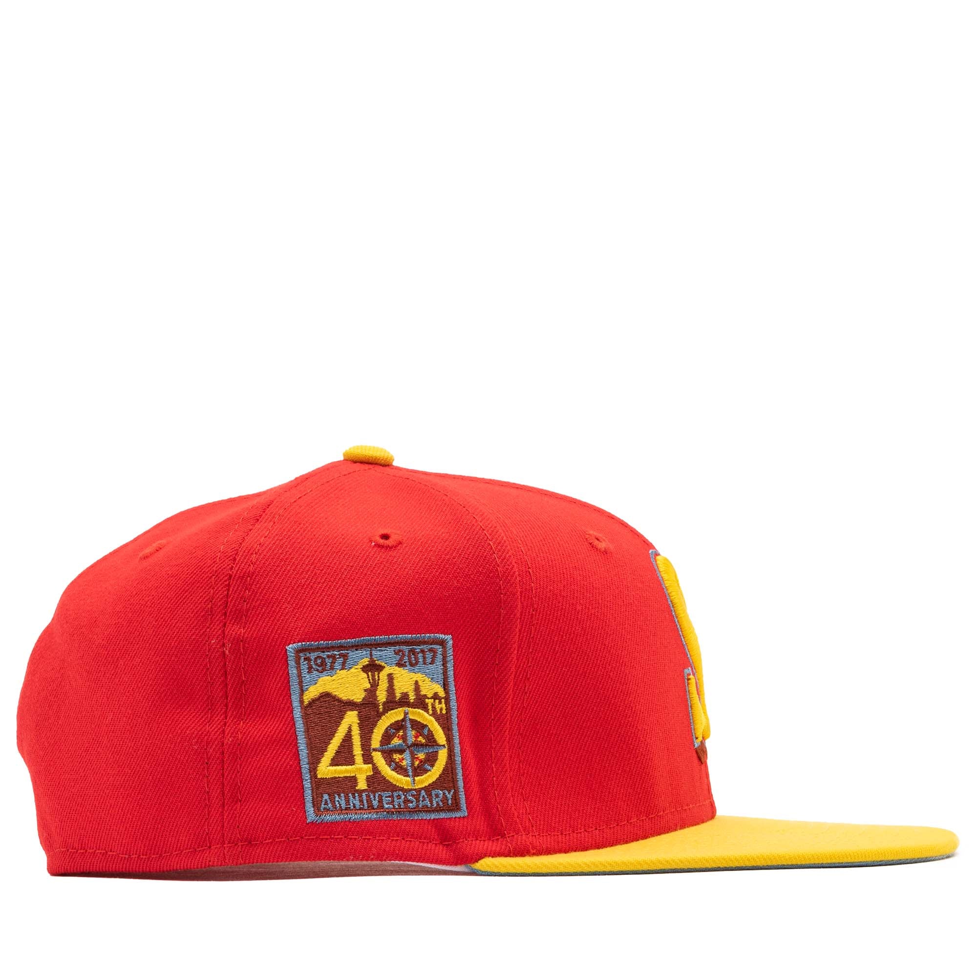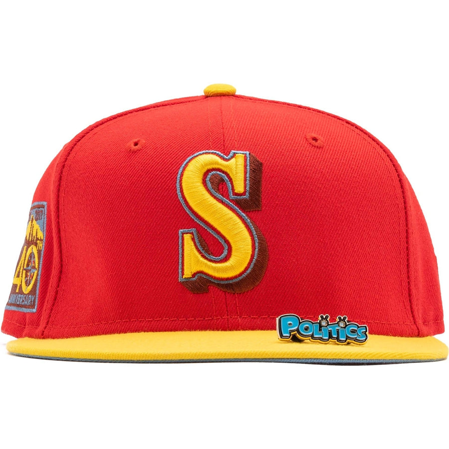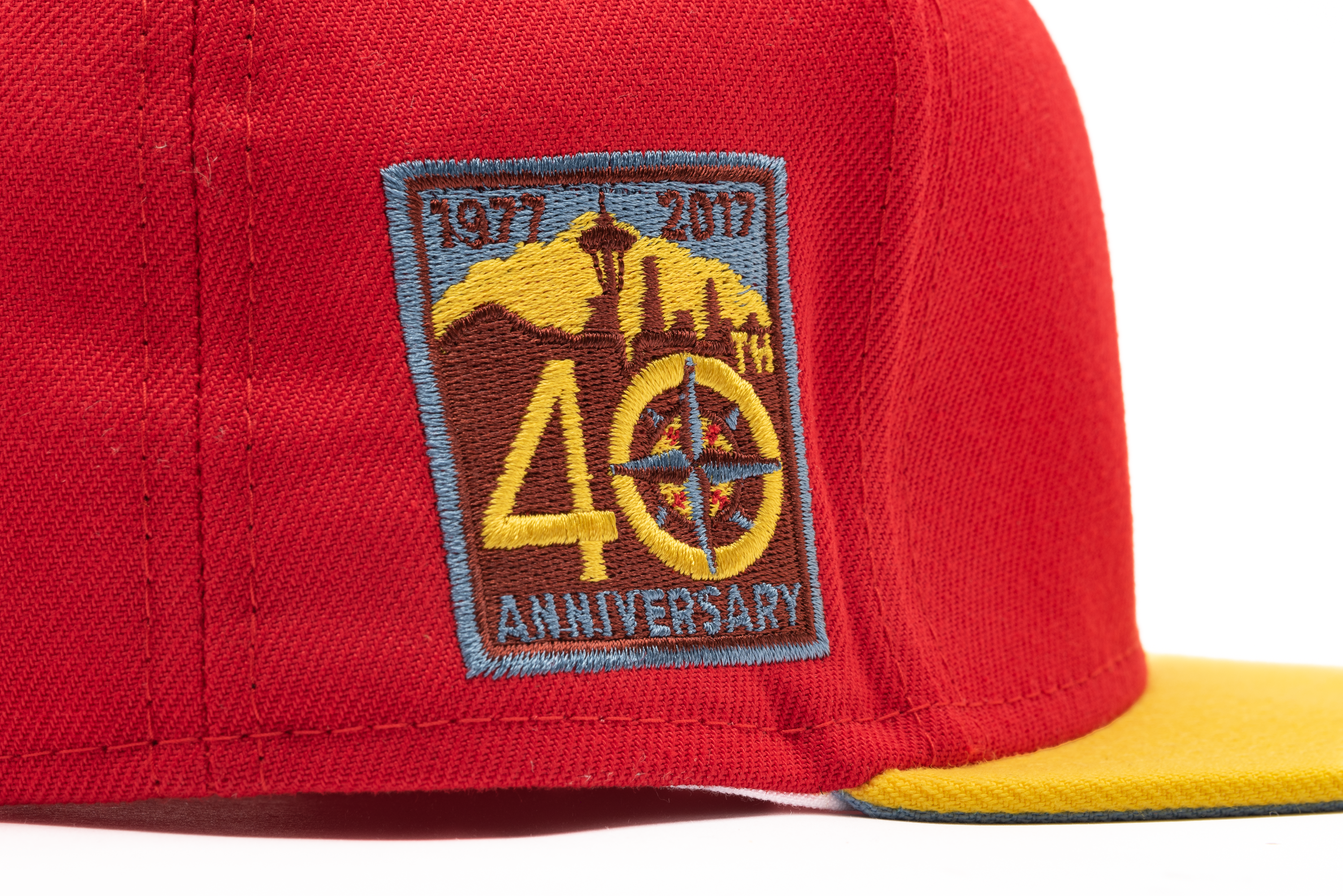 This New Era Seattle Mariners 40th Anniversary fitted hat was released by Sneaker Politics. The fittted has a red six panel structured high crown and embroidered eyelets with a yellow fabric squatchee button and flat bill. The fitted has a light blue undervisor and white sweatband. The front panel features the Seattle Mariners "S" logo embroidery and a 40th Anniversary side patch on the right panel. The fitted hat colorway and theme was inspired by Stewie from Family Guy.