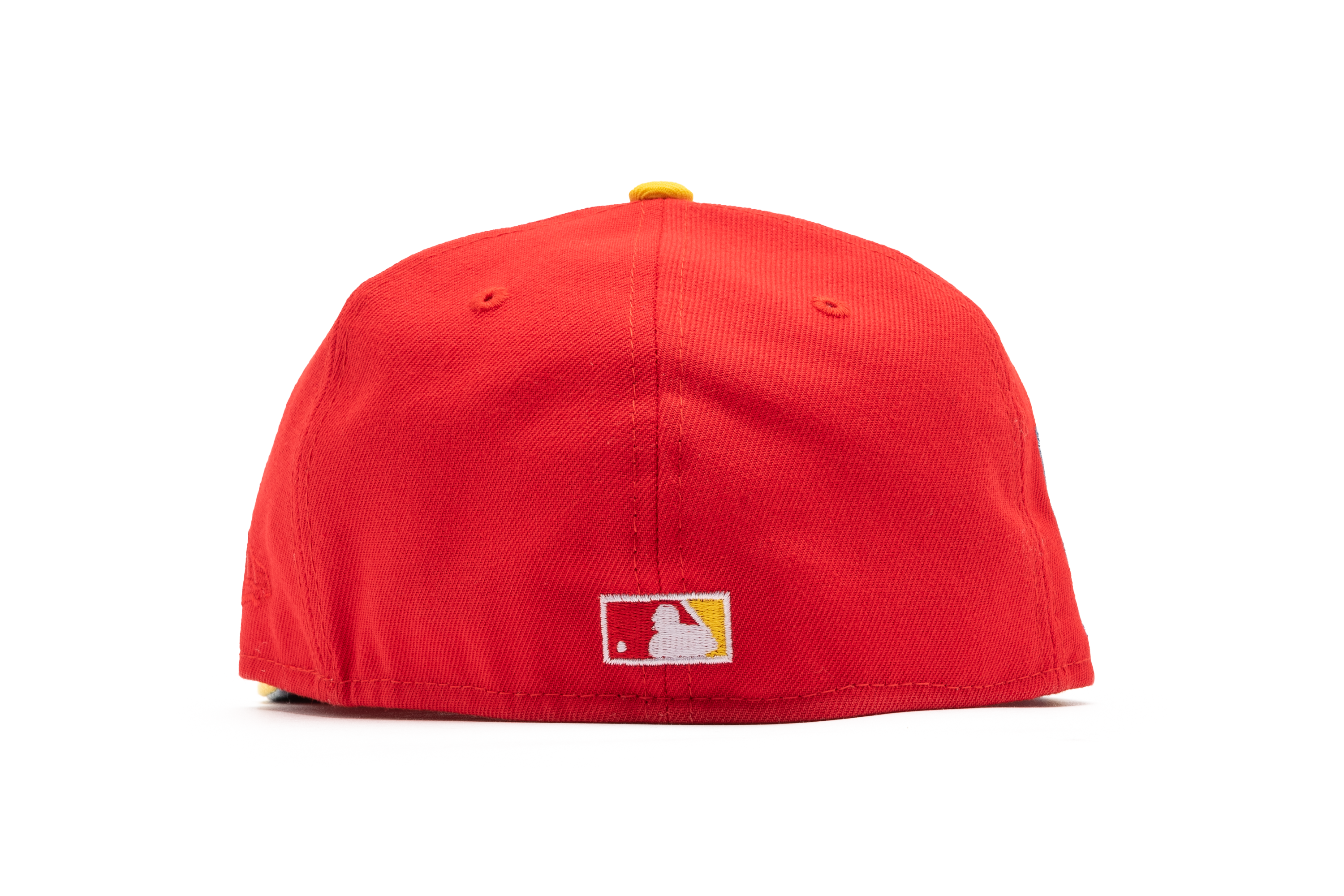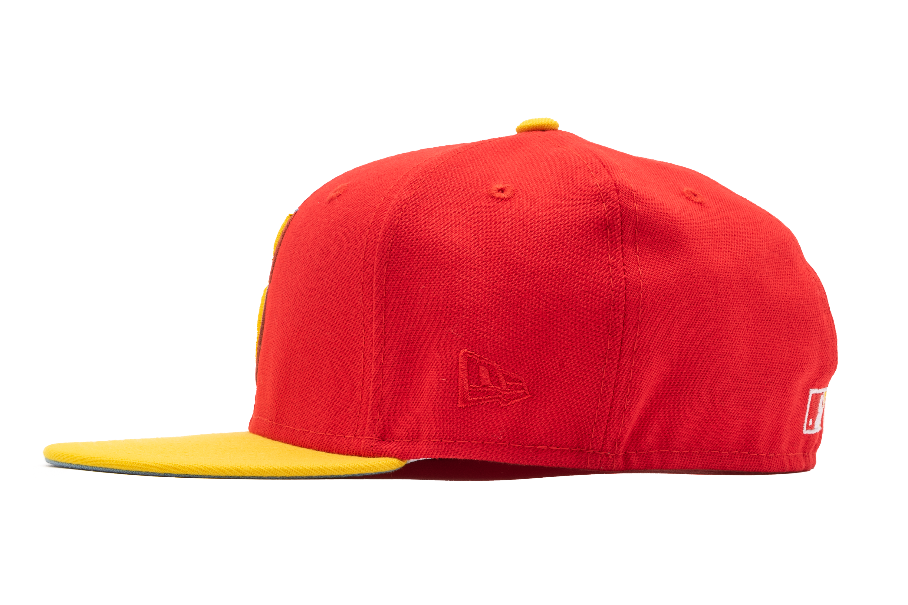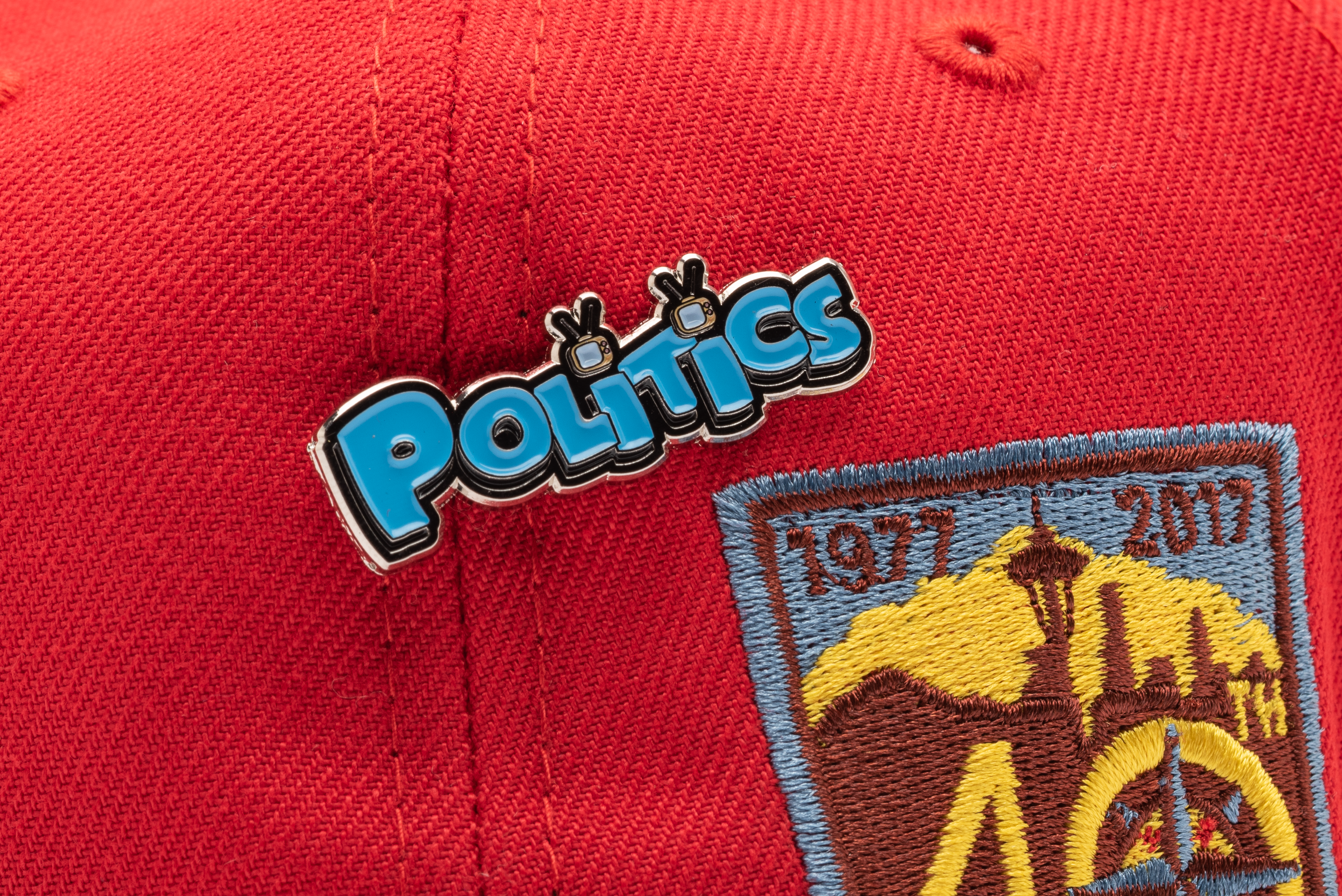 This New Era Seattle Mariners 40th Anniversary fitted hat was released by Sneaker Politics. The fittted has a red six panel structured high crown and embroidered eyelets with a yellow fabric squatchee button and flat bill. The fitted has a light blue undervisor and white sweatband. The front panel features the Seattle Mariners "S" logo embroidery and a 40th Anniversary side patch on the right panel. The fitted hat colorway and theme was inspired by Stewie from Family Guy.