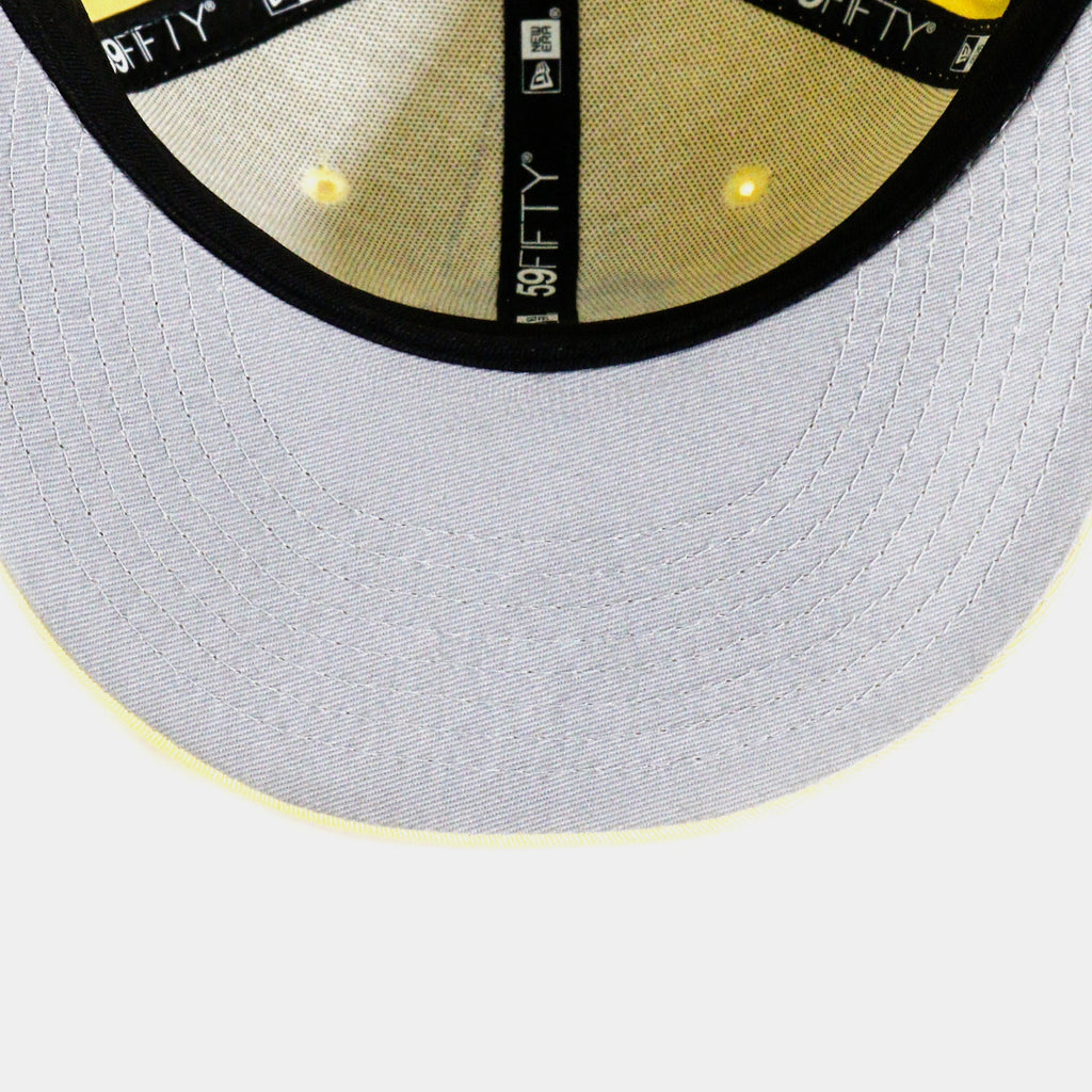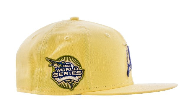 This New Era Florida Marlins 59FIFTY fitted hat is a Shoe Palace exclusive drop. The six panel structured high crown, embroidered eyelets and fabric squatchee button is soft Canary Yellow. The flat bill of the fitted cap is also soft yellow with a grey undervisor and black sweatband. The front and right panel features navy blue threads.