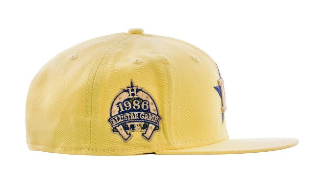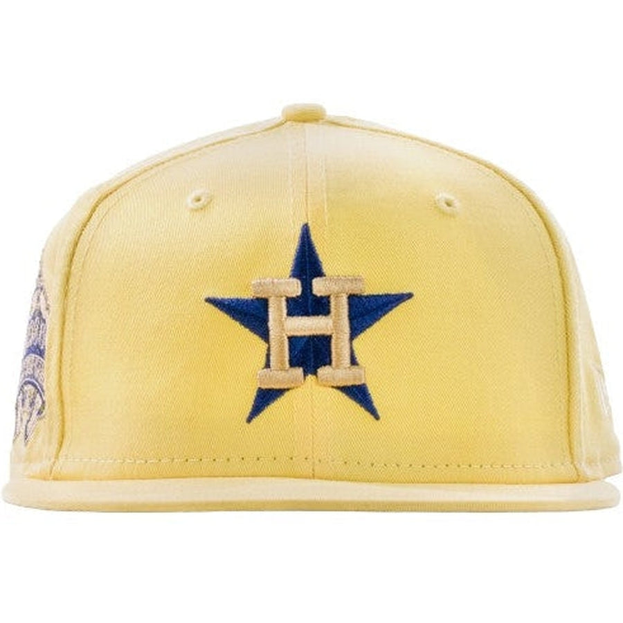 This New Era Houston Astros 59FIFTY fitted hat is a Shoe Palace exclusive drop. The six panel structured high crown, embroidered eyelets and fabric squatchee button is soft Canary Yellow. The flat bill of the fitted cap is also soft yellow with a grey undervisor and black sweatband. The front and right panel features navy blue threads.