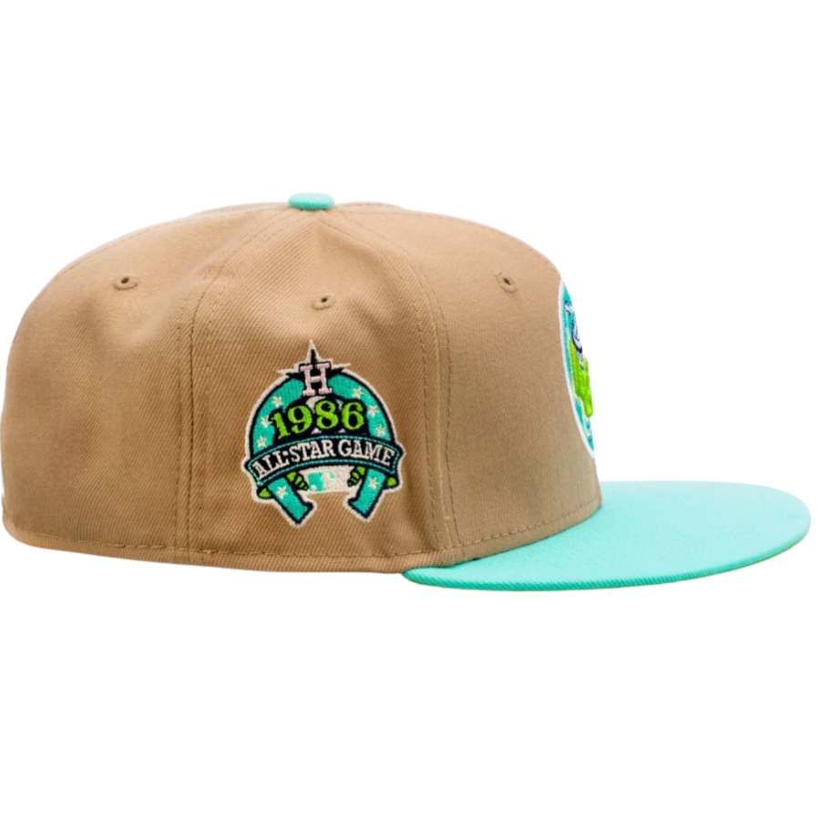 This New Era x Shoe Palace Houston Astros 'Winter Wonderland' Beige/Mint 2023 59FIFTY Fitted Hat was released by Shoe Palace. The fitted has a beige six panel structured high crown and embroidered eyelets with a mint fabric squatchee button and flat bill. The fitted cap has an lime green