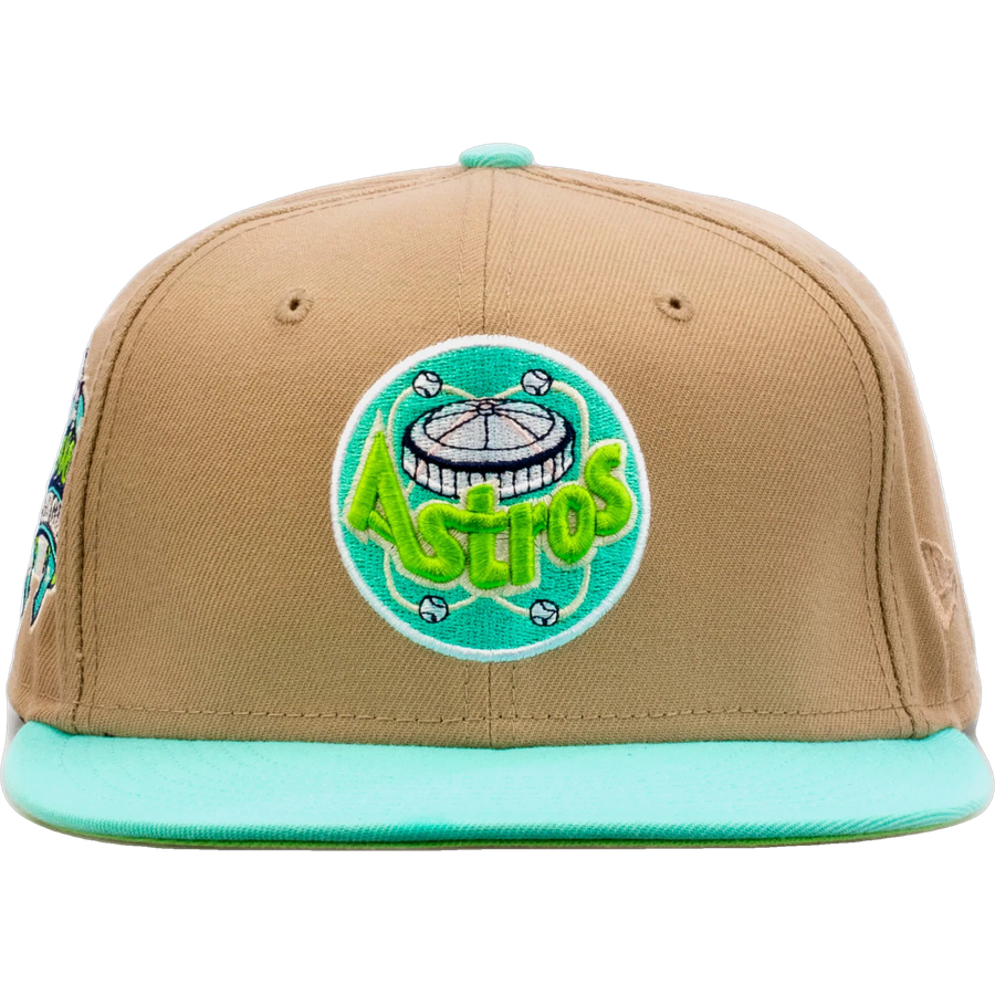 undervisor with a black sweatband. The front panel features the Houston Astros logo embroidery and a side patch embroidered on the right panel. The left panel of the fitted displays the New Era logo and the official MLB logo insignia embroidered on the rear crown.