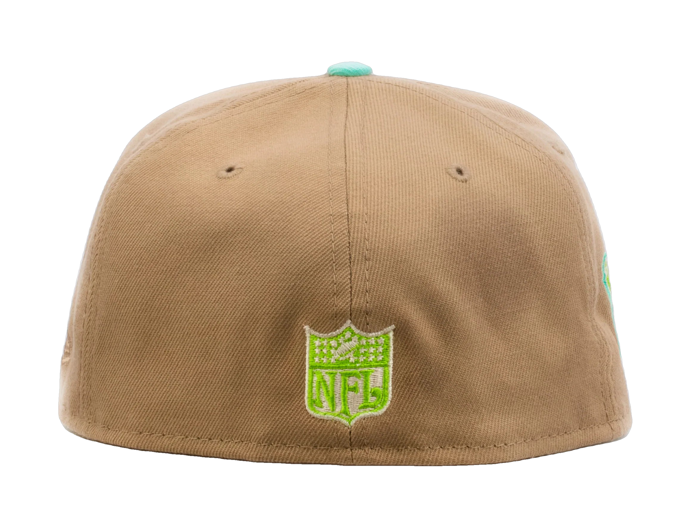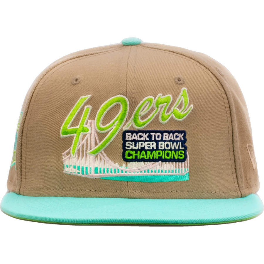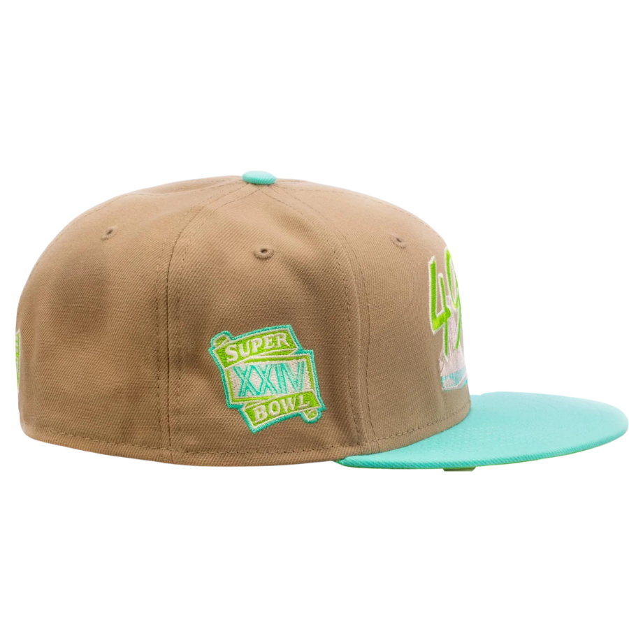This New Era x Shoe Palace San Francisco 49ers 'Winter Wonderland' Beige/Mint 2023 59FIFTY Fitted Hat was released by Shoe Palace. The fitted has a beige six panel structured high crown and embroidered eyelets with a mint fabric squatchee button and flat bill. The fitted cap has an lime green