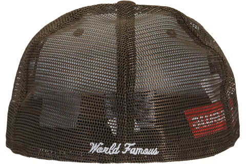 This New Era x Supreme Characters 59FIFTY fitted hat has a brown six panel structured high crown, brown embroidered eyelets and a brown fabric squatchee button. The fitted cap also has a brown flat bill. The front panel features the Supreme box logo embroidery. The rear crown of the fitted is mesh back.