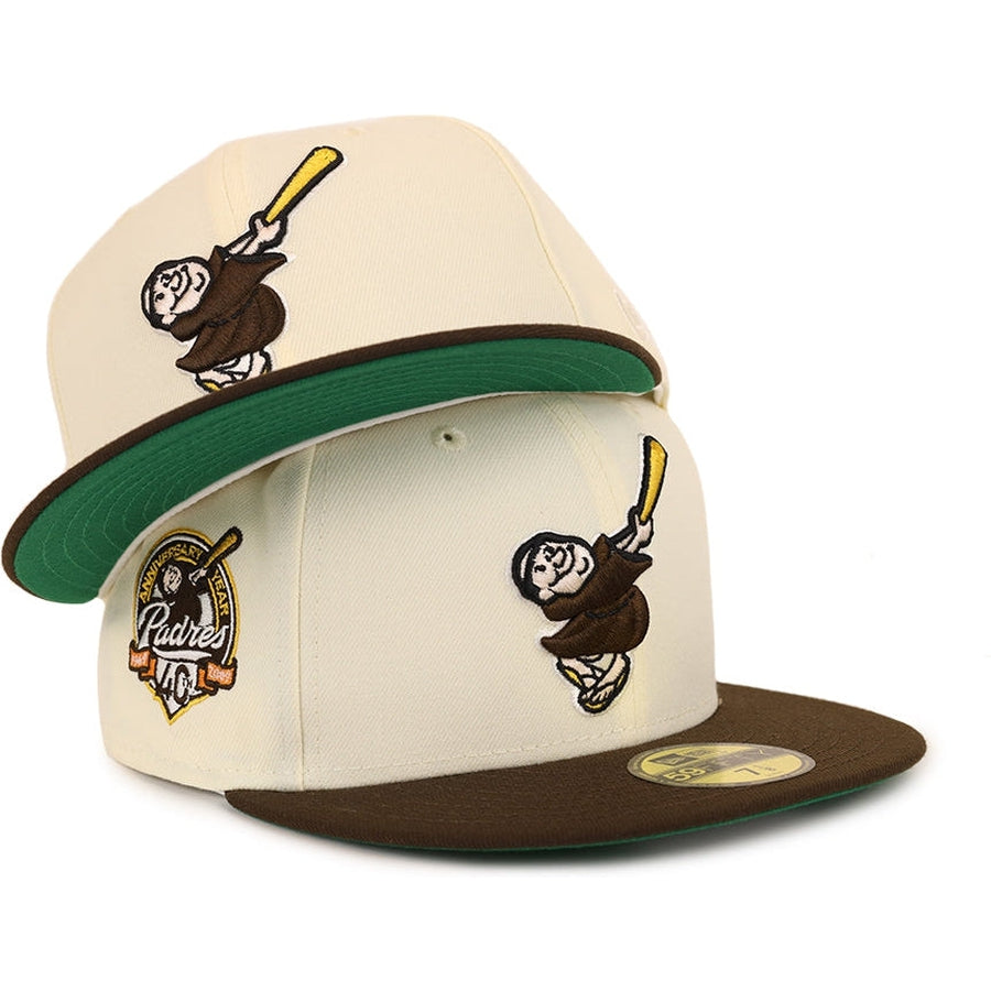 This New Era New Era CrownMinded X Hallucinathan San Diego Padres 40th Anniversary 2022 59FIFTY Fitted Hat was released by CrownMinded. The fitted has an off-white six panel structured high crown and embroidered eyelets with a dark brown fabric squatchee button and flat bill. The fitted has a green undervisor with the San Diego Padres mascot logo embroidery on the front panel and a side patch on the right-wear side.