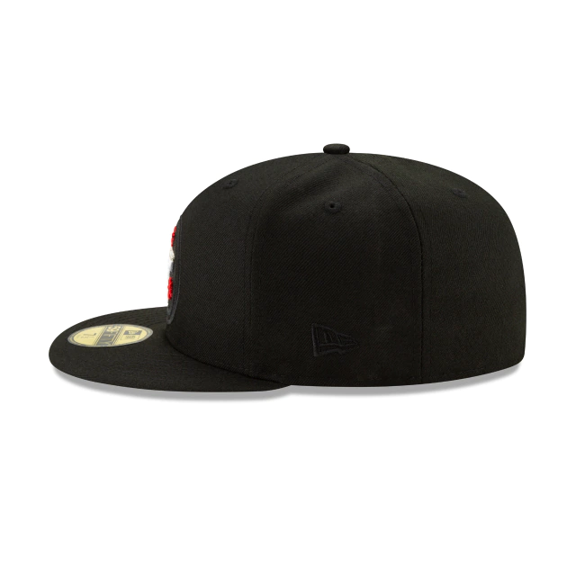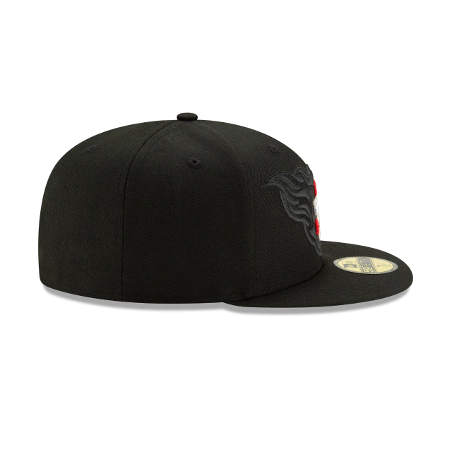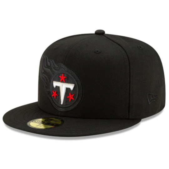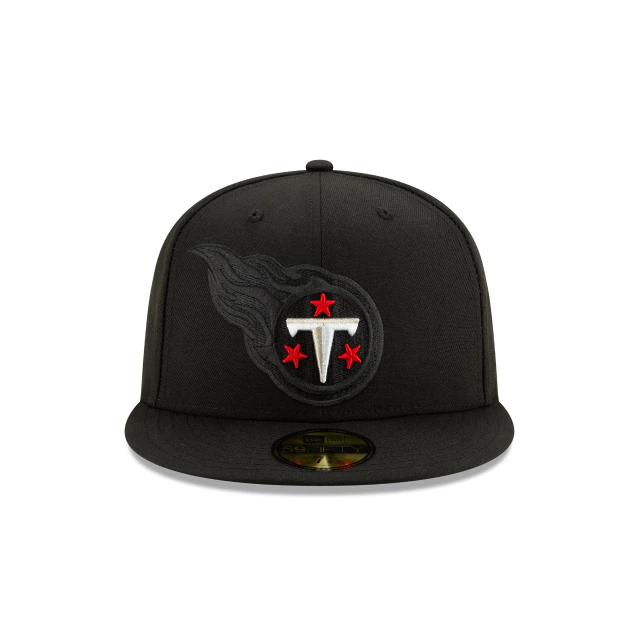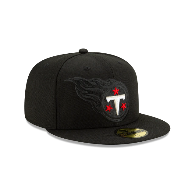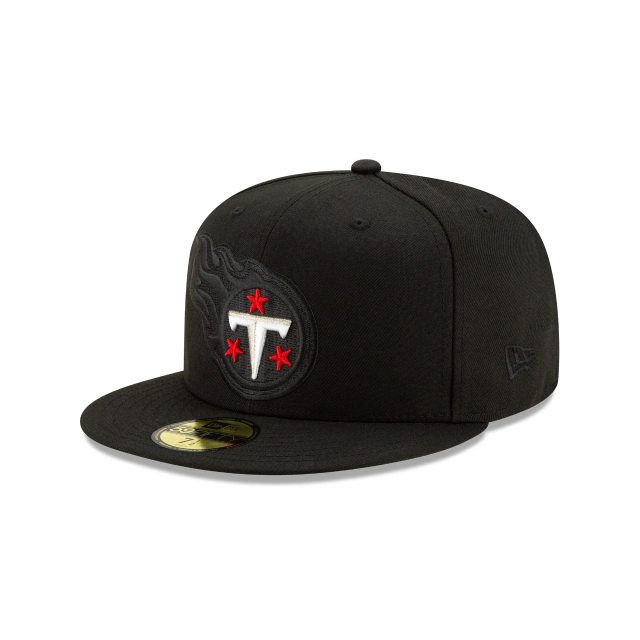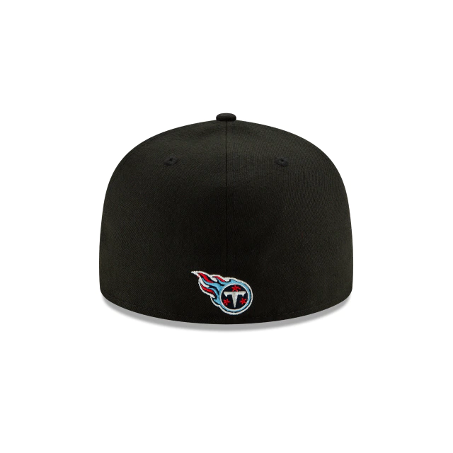 The Tennessee Titans NFL Logo Elements 2.0 59FIFTY Fitted Cap features a black fabrication with team colors used to highlight unique elements of an embroidered Titans logo at the front panels. Additional details include a classic team logo embroidered at the rear.