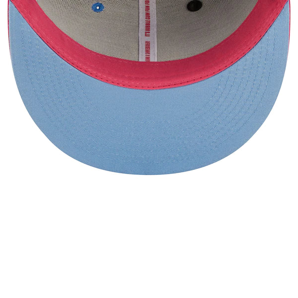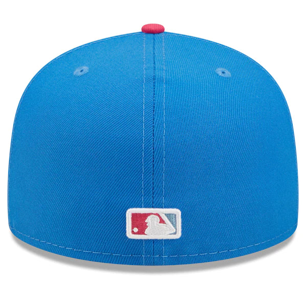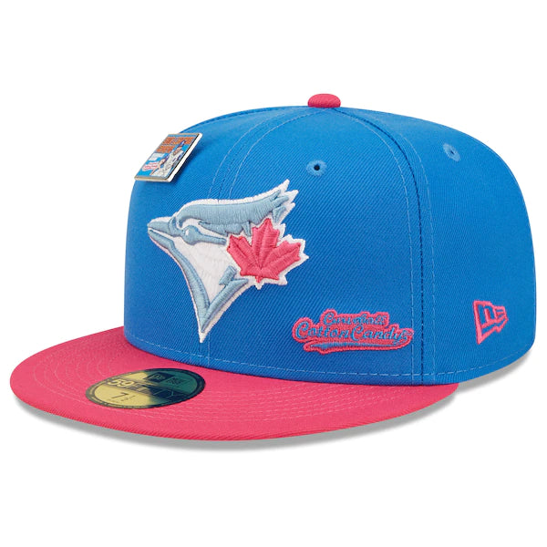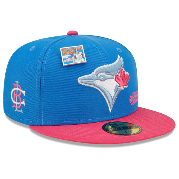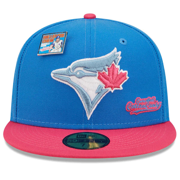 The MLB and Big League Chew have teamed up to bring Toronto Blue Jays fans this one of a kind, Curveball Cotton Candy Flavor Pack 59FIFTY Fitted Hat. Featuring a high crown and flat bill, this New Era hat will take your game day look to the next level. Its classic and fun graphics combine your Toronto Blue Jays and your all-time favorite Big League Chew flavor, making it unlike anything else in your collection.